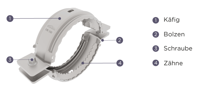 Die PAM-GLOBAL® UNIGRIP Kralle für Pressstopfen dient zur Sicherung der Pressstopfen in Bereichen mit erhöhter Innendruckbelastung, wie im Rückstaubereich oder im unteren Bereich von hohen Fallleitungen ohne Abgänge (z.B. Regenwasserfallleitungen). Die UNIGRIP Kralle wird ohne Verbinder direkt über den Pressstopfen montiert.